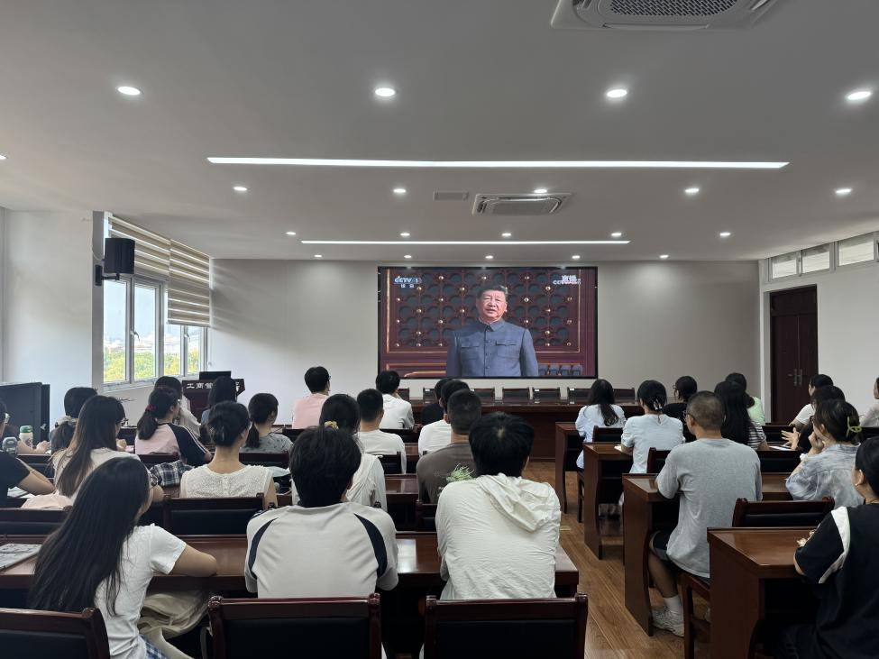 在德济楼408会议室,博远楼105、106教室组织师生共同观看纪念中国人民抗日战争暨世界反法西斯战争胜利80周年大会直播,重温抗战历史,汲取奋进力量。