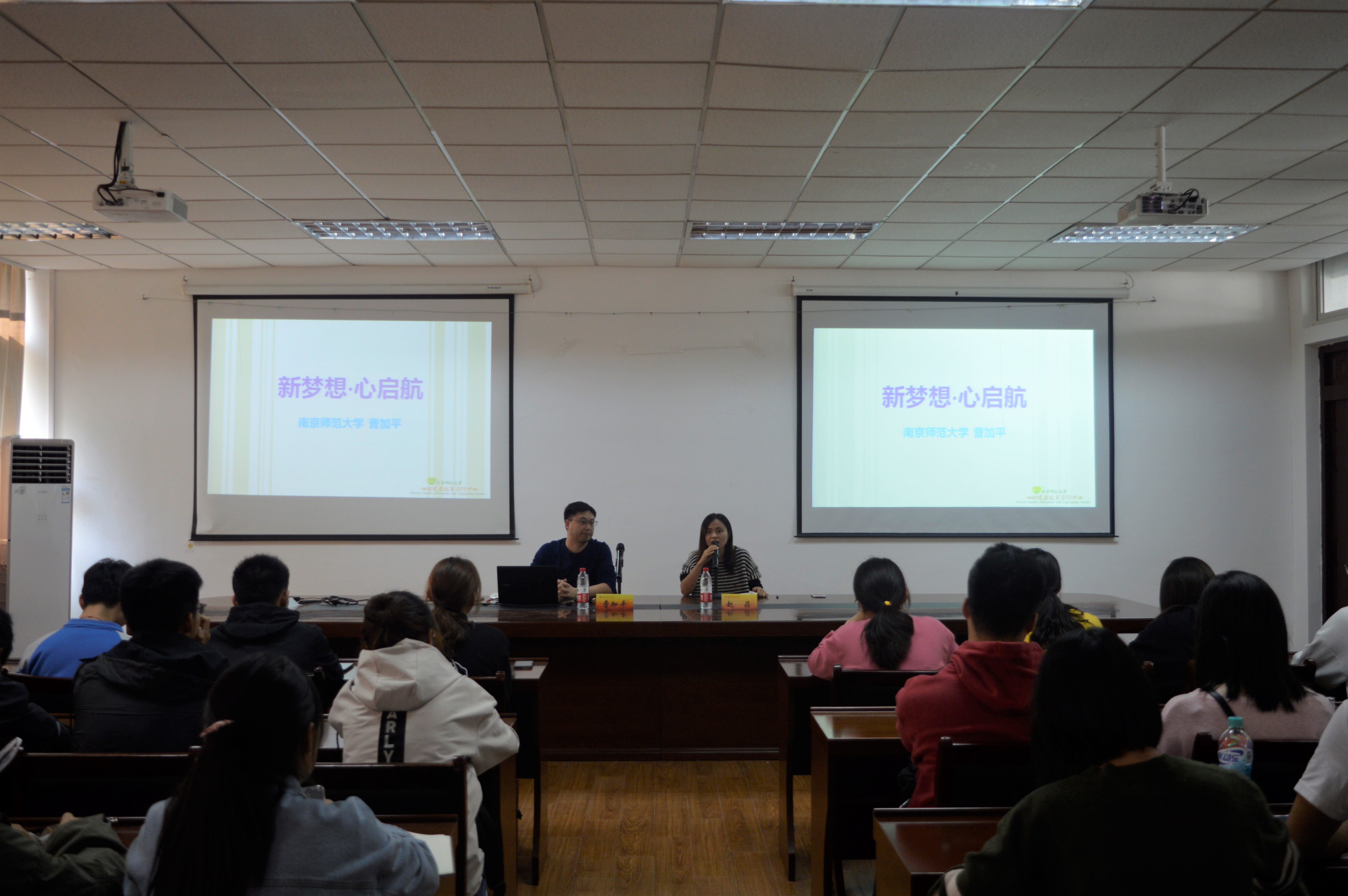 11月5日中午12:20—13:30,学院邀请南京师范大学学生处心理健康教育与咨询中心主任曹加平副教授在仙林校区德济楼408室举行“适应大学生活,用‘心’开启旅程”主题讲座。曹老师首先从学习、友情、爱情等角度分析了大一新生心理问题产生的原因,并对一些普遍存在的心理问题进行了简单的心理疏导。接下来,曹老师借助十只狐狸的故事以及生活中的实例给出了一些如何避免焦虑情绪、迷茫情绪的建议。整场讲座曹加平老师以幽默风趣的语言引起了大家的兴趣,开拓了同学们的知识视野、更新了他们的思想观点,相信通过本次讲座很多同学都会以更加得当的方式调节自己的情绪。