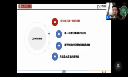 人力资源专业09级毕业生、南京德锐企业管理咨询有限公司的合伙人、项目总监、产品总监李志华通过腾讯会议作了题为“赢在起点”的南财就业讲堂线上讲座。讲座由91传媒