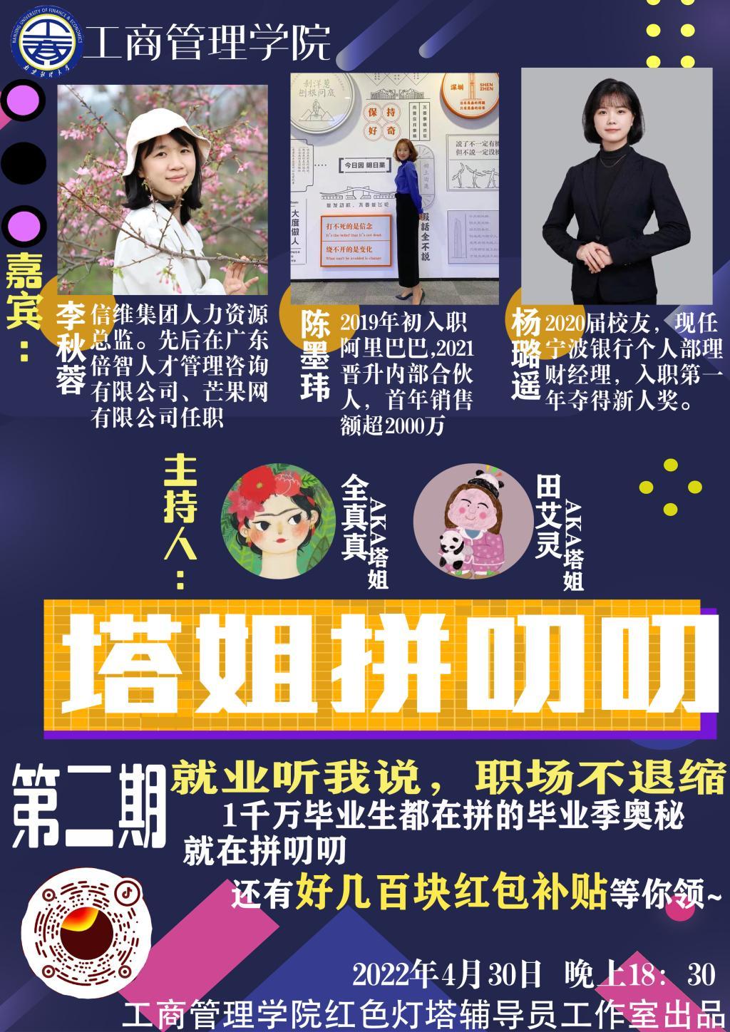 红色灯塔辅导员工作室在抖音开设了“塔姐拼叨叨”系列直播活动。近日,南财就业讲堂,以“就业听我说,职场不退缩”为主题的直播如约而至,直播邀请了信维集团人力资源总监、我校2009届校友李秋蓉,阿里巴巴内部合伙人、我校2018届校友陈墨玮,以及宁波银行个人部理财经理、我校2020届校友杨璐遥作为嘉宾。直播由91传媒