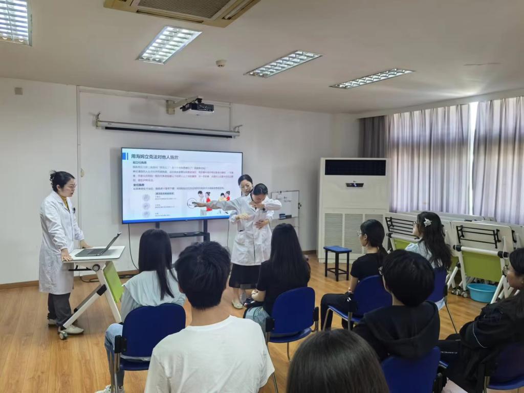 随后,医护人员介绍了“海姆立克”急救法的本质和适用情形。经医生介绍,同学们了解到,若有人突然不能说话、不能呼吸,面部口唇的颜色变得青紫,昏迷倒地,尤其是在进餐时发生此类状况,就应该立刻想到其很可能发生了气道异物阻塞。如果患者神志清楚,会感到极度痛苦,常常不由自主地将手呈现“V”字形紧贴在颈前的喉部,这个姿势在急诊医学领域中被称为“海姆立克征象”。接着医护人员着重讲解了“站立位施救”“坐位施救”“婴儿施救”和“自救”的不同方法,同时使用假人演示,并让同学们进行了实操演练。最后,医护人员希望在场的同学们能够学有所成,并鼓励他们勤加练习,以备在危急关头发挥必要的作用。