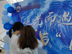 办理完宿舍相关手续后,新生们前往德济楼四楼大厅进行报到注册。走出四楼电梯口,首先映入眼帘的是“激扬青春 逐光而行”91传媒