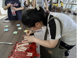 在迎新现场,新生们在报到处核验身份后便可以领取一张星星形状的贴纸,他们在上面写下自己的名字并贴在星空签到墙上。每一颗星星都散发着独特的光芒,每一个人都将在南财追逐光,成为光,散发光,照亮未来的求学之路。签到完毕后,新生们移步至读书角领取励志书签,并书写推荐书籍及寄语,领取南财定制明信片、钥匙扣等文创礼品。迎新过程中,程永波校长一行来到学院慰问迎新工作人员以及新生和家长,并表达了对新生的亲切问候和期许。