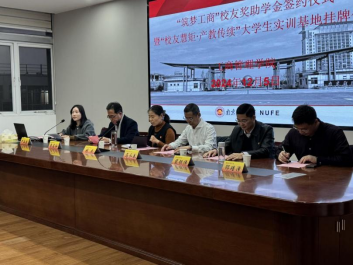 在与会嘉宾的见证下,校方与校友代表共同签署了“筑梦工商”校友奖助学金捐赠协议,并为“校友慧炬·产教传续”大学生实训基地揭牌。