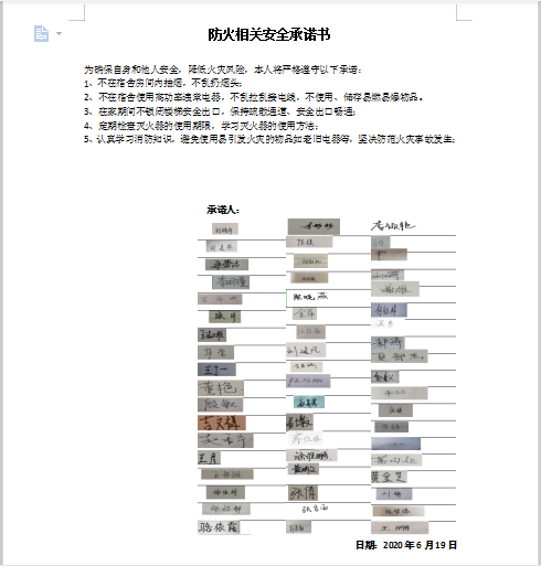 各年级围绕“安全生产月”开展了一系列活动。各年级分别召开“安全生产月”活动启动仪式,并以“安全生产月之校园防诈骗”和“安全生产月之防火安全”为主题的班会,以视频观看和案例讲述的形式让同学们掌握了一些相关安全常识与解决措施。会后,同学们签署了《大学生防诈骗倡议书》和《防火相关安全承诺书》。