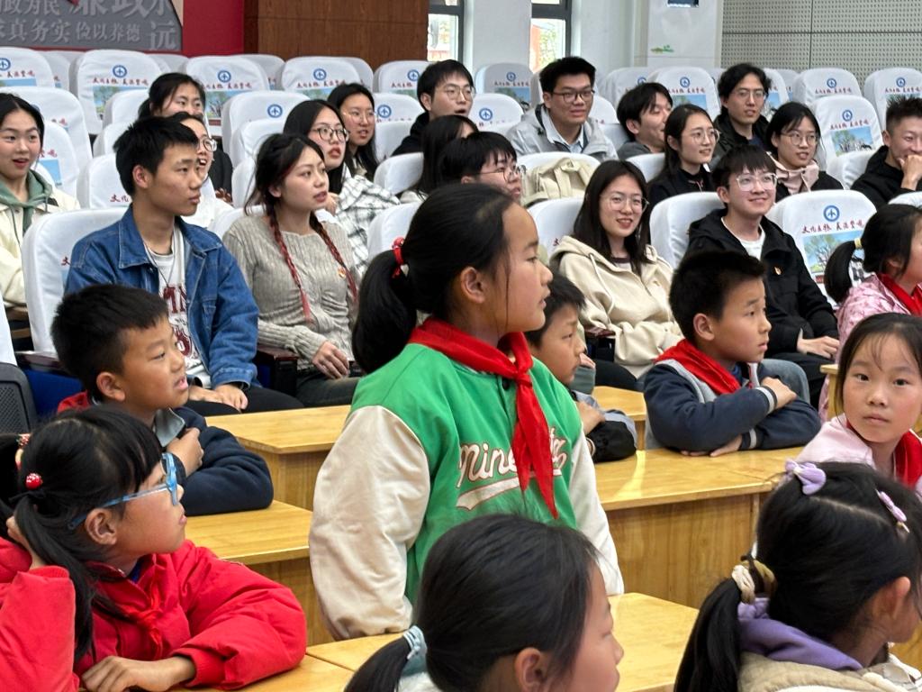 本科生学生党员郭洋洋、吴婧欢、唐伊菲、郭爱连成立“红色故事宣讲团”,与茅山中心小学的小学生共讲红色故事,进一步增强青少年的爱国情和民族情,树立正确的爱国主义观念。党员学生金灿向小学生分享“花中有花 题中有题”南京非遗剪纸。通过“大手拉小手、大学生带小学生”的方式一起体验南京非遗剪纸,促进中华优秀传统文化的传播,增强文化自信。