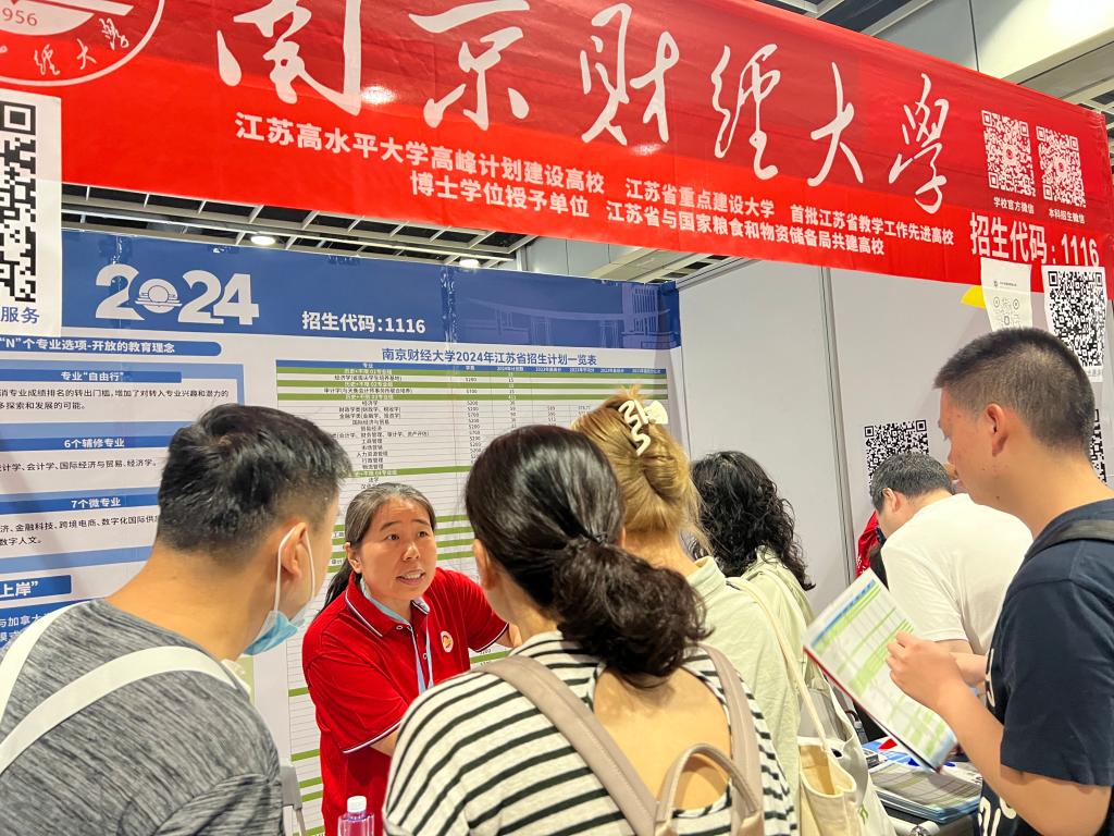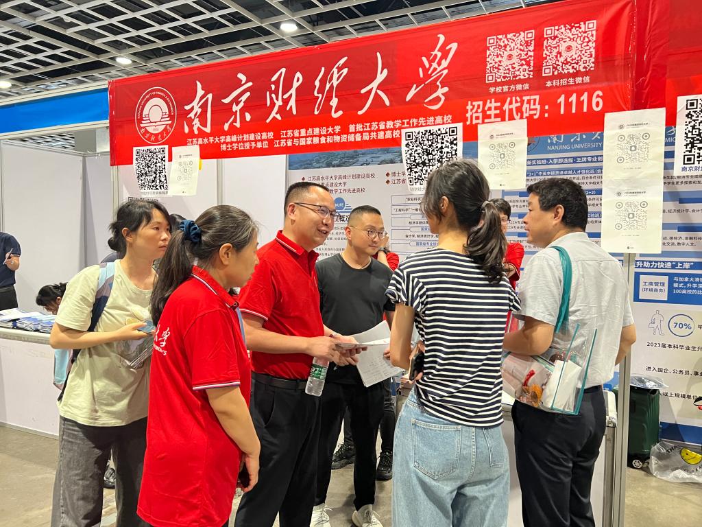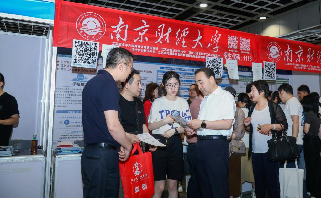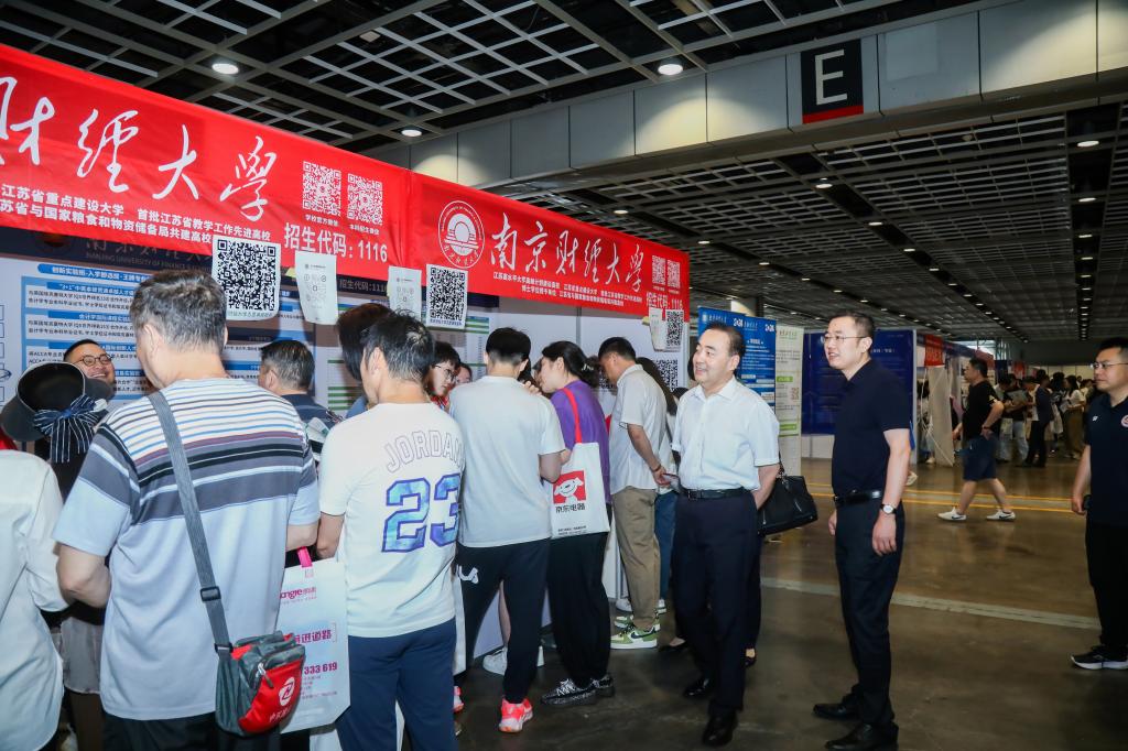 6月26日上午,校长程永波,校党委副书记李群,党委常委、副校长赵国栋、叶林祥一行赴南京国际展览中心开展本科招生宣传并看望招生宣传工作人员。党政办主任郑锷,学生处处长韩力争,91传媒