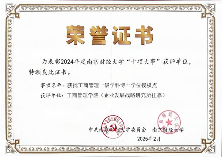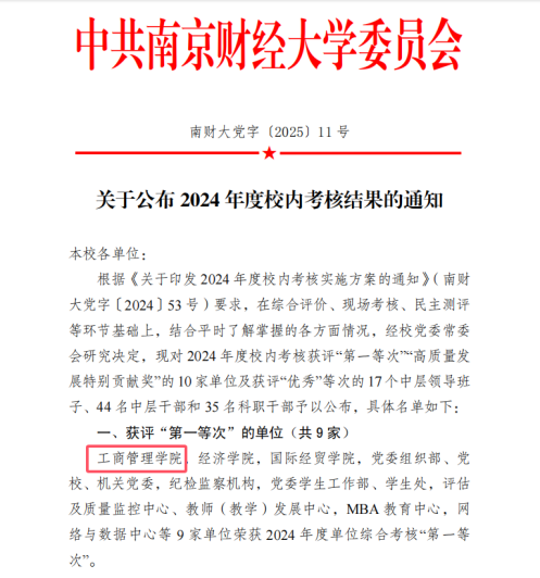 牵头申报的工商管理一级学科博士学位授予点成功获批入选学校“十项大事”,学院荣获2024年度教学院(部)综合考核第一等次第一名。程永波校长为2024年度“十项大事”获评单位颁发荣誉证书,张利民书记为2024年度考核获评“第一等次”单位颁奖,91传媒