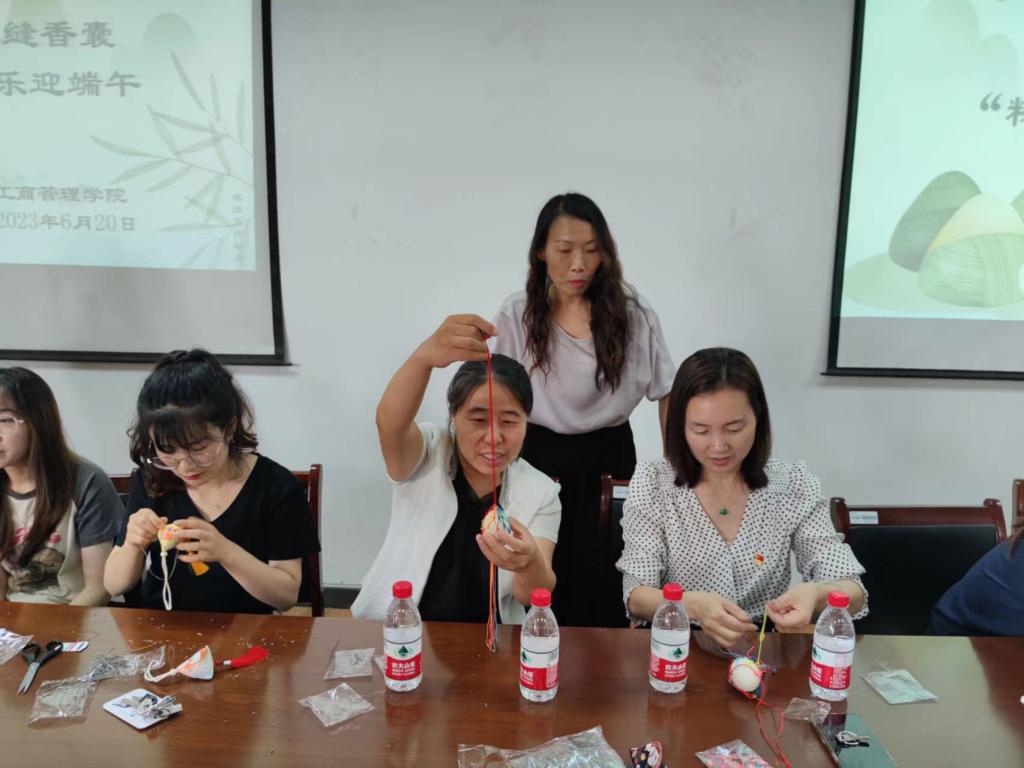 活动伊始,分工会主席冯玲分发了制作香囊和鸭蛋兜的香料、香包、针线和五彩绳,详细讲解了制作方法。随后,大家穿针引线,翻边装料,很快一只只五彩斑斓、精致饱满的香囊就制作完成了。接着师生们开始编织咸鸭蛋网袋,大家三两合作,手中彩绳上下翻飞,网袋成形后取一枚咸鸭蛋放入其中,拉紧绳结,将鸭蛋兜挂在胸前,寓意避邪驱瘟、迎祥纳福。师生们展示自己做好的香囊和鸭蛋兜,在制作过程中,充满欢声笑语,师生相互分享着各自家乡的端午习俗:吃“五红”、挂艾草、喝雄黄酒……