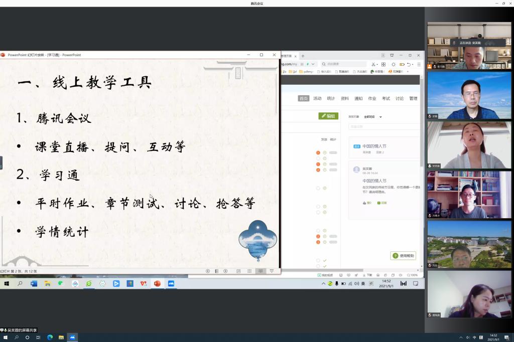 会上,吴芙蓉和朱凌玲两位教师与大家分享了在线教学经验。对如何使用学习通、雨课堂等教学软件进行一一演示和讲解,就线上线下教学分享了各自心得体会。