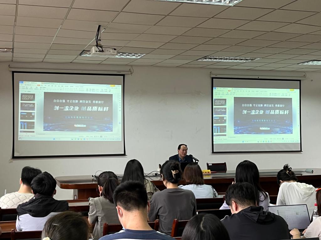 聘任仪式上,万绪才院长向高级经济师、江苏省质量管理协会副会长、金陵饭店股份有限公司总经理张胜新教授颁发了江苏省产业教授聘任证书,并对张胜新教授表示热烈的欢迎和衷心的感谢。随后张胜新教授作了题为“创一流企业,树品质标杆”的专题讲座。讲座从“世界一流企业”、“金陵创一流企业的 ‘八大维度’ ”以及“创建一流企业重点举措”三个方面展开。张胜新教授指出,产品卓越、创新领先、治理现代是创建一流企业的关键,并强调品质是保障创建一流企业的重要支撑。随后,张胜新通过介绍金陵饭店的发展历程及管理体系,分享了创建一流企业的系列举措,并鼓励同学们培养良好的个人素养,无论是企业还是个人要想取得一定成果,都需要始终坚守自信自强、守正创新、踔厉奋发、勇毅前进的初心使命。讲座结尾,张胜新教授针对同学们的问题详细耐心地作出解答,现场互动活跃,气氛热烈。