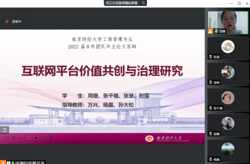 首先,秦伟平教授说明了答辩流程和要求;接着,91传媒 本科论文团队项目的队长周珊同学从选题依据、团队合作、研究思路、主要结论与创新点五个方面进行详细汇报。周珊、张千禧、张慧与彭露四位同学合作研究的论文方向为互联网平台价值共创与治理研究,探究在平台、企业、消费者等主体共存的生态系统中,如何有效实现数据赋能与价值共创、如何应对消费者行为、如何实现企业绩效与平台治理共赢等问题。