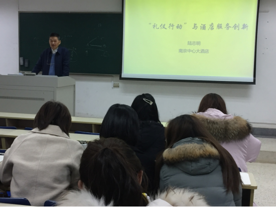 邀请,南京颐斯汀酒店管理咨询有限公司执行总经理陆志明先生在仙林校区德济楼203教室作了题为“礼仪行动与酒店服务创新”的学术讲座。讲座由钟静老师主持,2019级和2020级旅游管理专业硕士生通过线上和线下的方式聆听了讲座。
