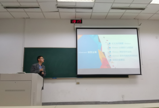 包哲石老师从文献的搜集入手,通过现场操作让同学们直观地了解到如何利用学校数据库选取自己想要的高质量文献进行研读,并主要围绕摘要的必要性、必备要素、写作实例和常用句式等四个方面阐述了一篇学术论文摘要和引言的重要性。同时,分享了阅读论文的心得体会,使同学们受益匪浅。