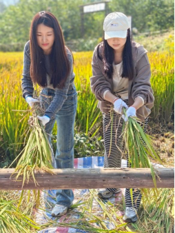 在村民的带领下,同学们领取镰刀和草帽后陆续下田,分工协作进行割稻打稻劳动。劳动过程中,同学们感慨到对“一粥一饭,当思来处不易;半丝半缕,恒念物力维艰”有了更深的体会。同学们还在地里摘取新鲜的蔬果,自主择菜、洗菜、烧饭,沉浸式体验农家生活。