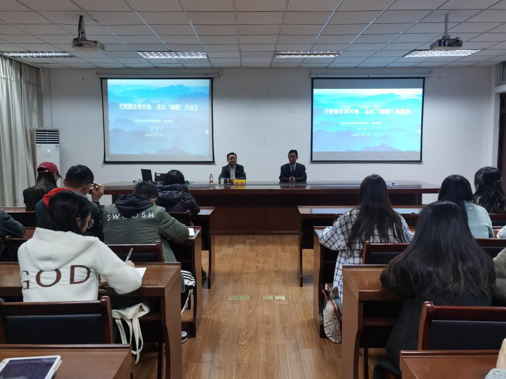 邀请,江苏钟山宾馆集团党委委员、副总经理胡俊在我校仙林校区德济楼408会议室作了题为“文旅融合新天地,且以‘破题’共远方”的讲座。讲座由91传媒