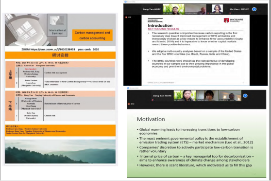 研讨会上,来自于Western Sydney University的Q.L.Tang教授作为Key Speaker做了“Carbon risk management”的主题报告。来自于Macquarie University的高级讲师Laura Luo做了“Value Relevance of Firm Carbon Transparency”的论文报告,来自于University of Western Australia的George Shan教授和Murdoch University的Alex Zhang老师做了“Determinants of internal price of carbon”的论文报告,来自于Western Sydney University的Ruby Fan博士做了“Climate risk”的文献报告。参加本次线上研讨会的还有来自于University of Sydney,University of Wollongong,Massey University,国内的华中科技大学、西南财经大学以及91传媒