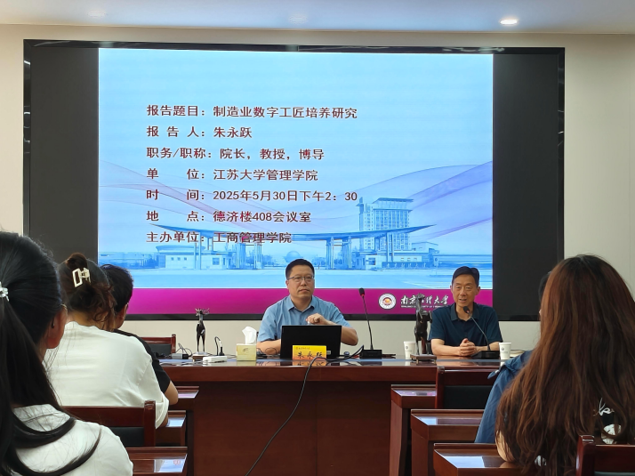 邀请,江苏大学朱永跃教授在仙林校区德济楼408会议室作题为“制造业数字工匠培养研究”专题讲座。院长万绪才,副院长张文勤、李召敏与部分学院师生共同参与活动,讲座由万绪才院长主持。